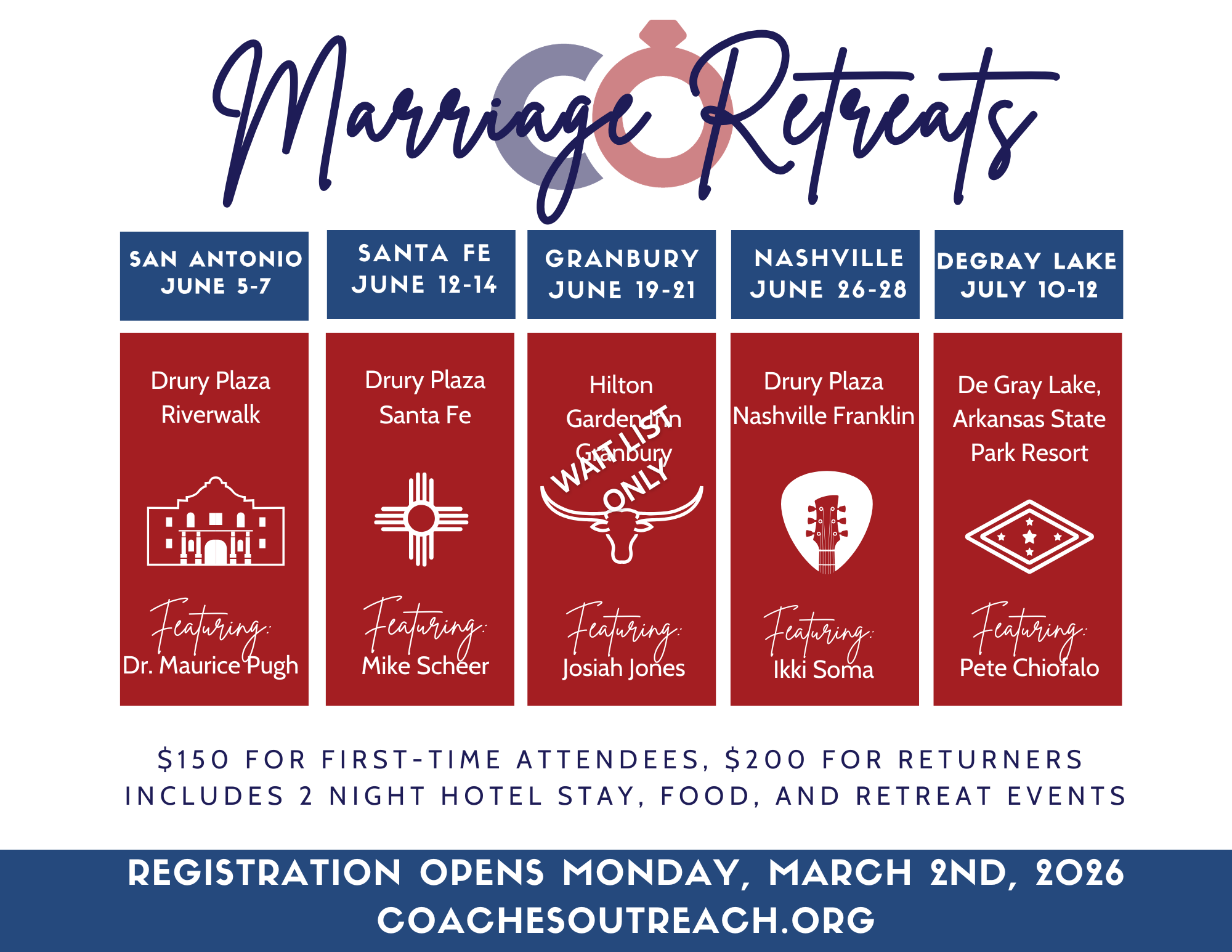 Late arrivals contact Coaches Outreach staff at 214-654-0042 and email retreats@coachesoutreach.org.